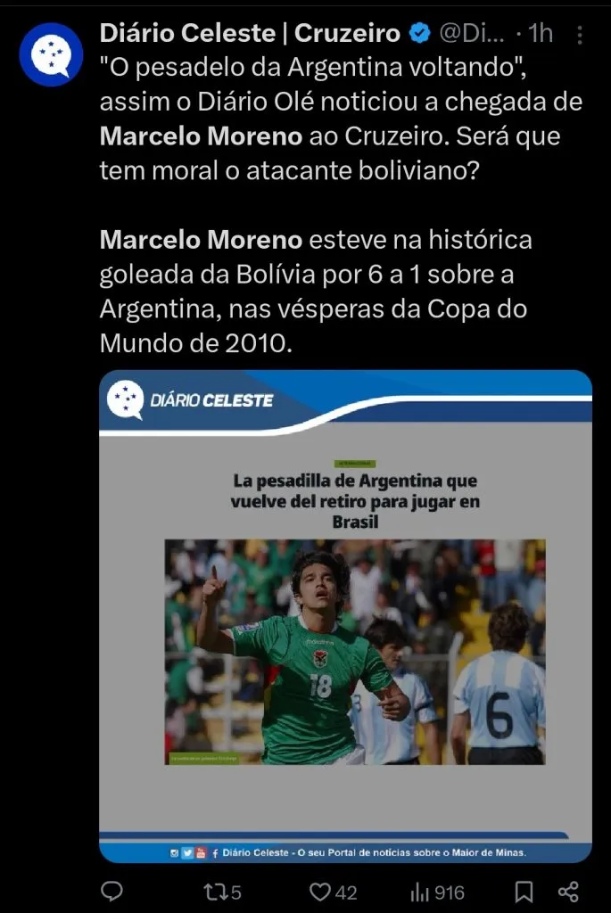 “O pesadelo da Argentina voltando da aposentadoria para jogar no Brasil”, destacou o jornal argentino assim que o boliviano de 36 anos foi anunciado pelo Cabuloso nas redes sociais.