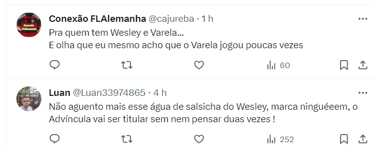 “Não aguento mais essa água de salsicha do Wesley, não marca ninguém. O Advíncula vai ser titular do time sem pensar duas vezes”, diz outro torcedor.