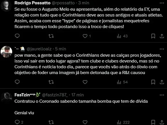 “Apesar da mudança de gestão, de Duílio para Augusto Melo, o Corinthians continua atrasando os pagamentos”, destaca o jornalista Jorge Nicola nesta segunda-feira (11).