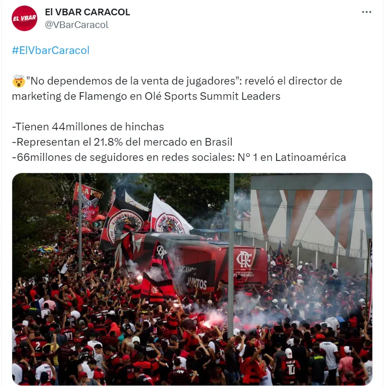 O levantamento do “Olé Sports Summit Leaders” sobre o Flamengo deixa qualquer torcedor do clube animado. Segundo a fonte, o Flamengo tem cerca de 44 milhões de torcedores espalhados pelo mundo; representa 21,8% do mercado do futebol brasileiro; tem 28% de preferência nacional entre pessoas de 6 a 24 anos de idade; 66 milhões de seguidores em todas as redes sociais; e é o número 1 da América Latina nas plataformas digitais, ficando cerca de 40% acima do São Paulo, segundo maior do Brasil.