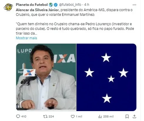 “Quem tem dinheiro no Cruzeiro chama-se Pedro Lourenço (investidor e parceiro do clube). O resto é tudo quebrado, só fica no papo furado. Pode tirar isso da minha boca. No Cruzeiro, eu só acredito em um cara, que se chama Pedro Lourenço. O resto é tudo quebrado, só papo furado, fica jogando para a plateia, como fez todo o ano passado”, disse o presidente do América-MG.