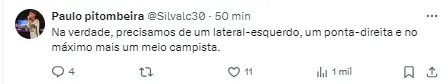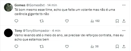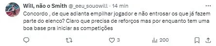 A fala do presidente chega em um momento que a comissão técnica mira recuperar jogadores que já estão dentro do elenco. A intenção é apostar no entrosamento do grupo já pensando no Campeonato Brasileiro.