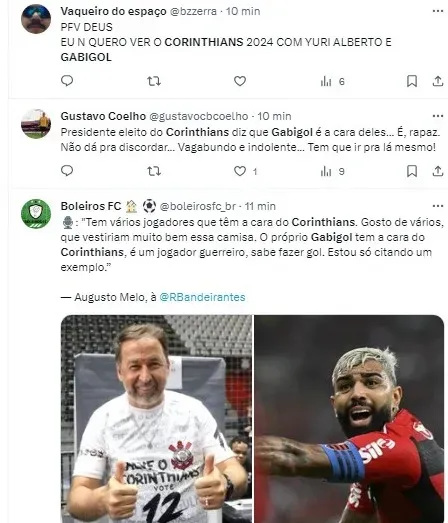 “Tem vários jogadores que têm a cara do Corinthians. Gosto de vários, que vestiriam muito bem essa camisa. O próprio Gabigol tem a cara do Corinthians, é um jogador guerreiro, sabe fazer gol. Estou só citando um exemplo, porque tem contrato e o salário dele é muito alto, mas é um jogador que gosto. O Soteldo é um jogador muito bom, o Marcos Leonardo, enfim, tem muitos que a gente gosta”. disse Augusto Melo.