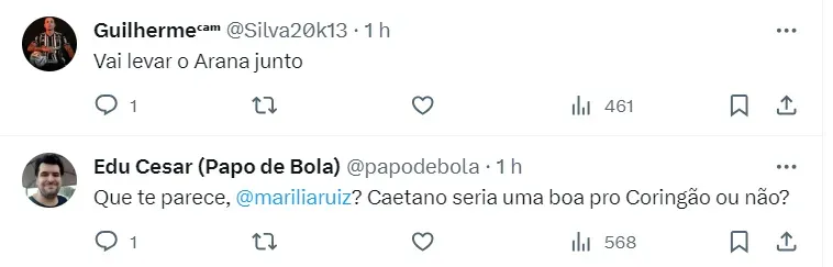 Heverton Guimarães compartilhou a informação de que está programada uma reunião nos próximos dias entre Augusto Melo e Rodrigo Caetano. O presidente do Timão expressou o desejo de contar com Caetano no clube em 2024.