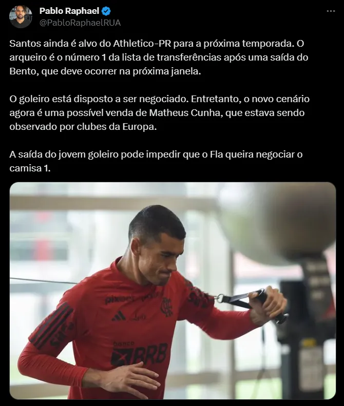 Conforme a fonte, o atleta é o número um do furacão para suprir a saída de Bento, que deve ser vendido para uma equipe do futebol europeu. Todavia, o time carioca avalia vender Matheus Cunha para o clube do Velho Continente, o que pode acabar barrando a saída de Santos.