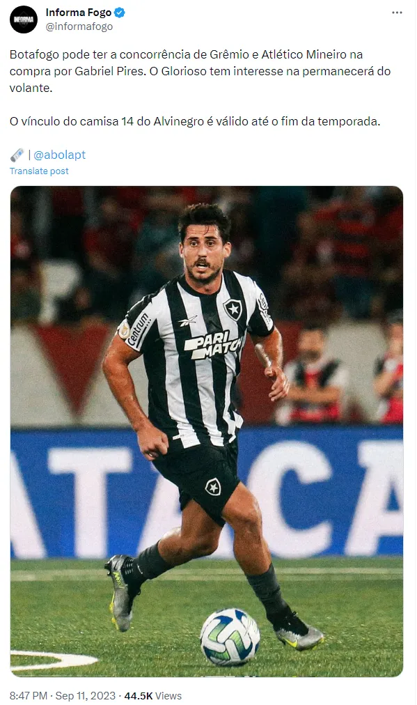 Entretanto, com o contrato de Gabriel Pires, que pertence ao Benfica de Portugal e está emprestado ao Botafogo, chegando ao fim ao final desta temporada, o volante começa a ser alvo de interesse de outros grandes clubes do futebol brasileiro.