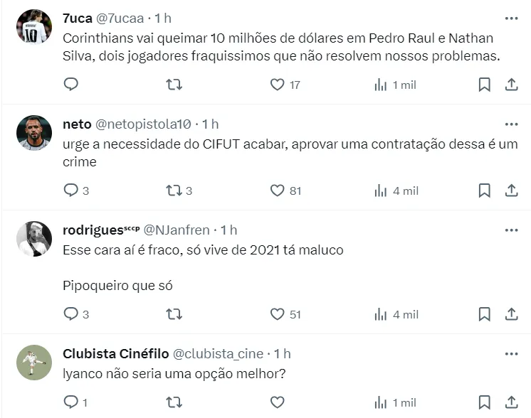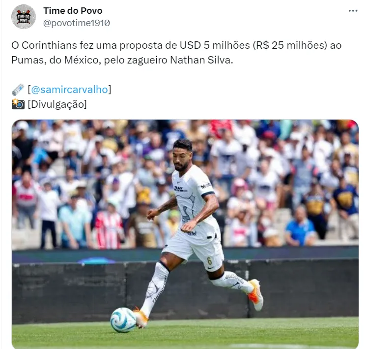 De acordo com o portal UOL Esporte, a oferta do Corinthians por Nathan Silva é avaliada em R$ 25 milhões. O montante já foi apresentado ao Pumas e a diretoria paulista aguarda resposta.