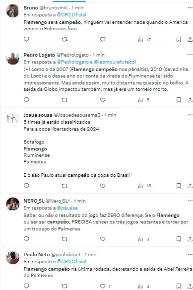 “Eu acho que o Flamengo tem mais do que 19% de chances de ganhar o campeonato. O Palmeiras com 55% está relativamente justo, mas o Flamengo tem uns 40%. O restante pode ser dividido entre os outros quatro concorrentes. Na ciência exata do achismo, vejo o Palmeiras com 55%, Flamengo com 40% e os outros 5% distribuídos entre os demais”, afirmou PVC.