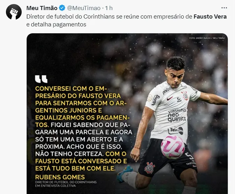 A situação de Fausto Vera com o Corinthians é de um contrato que vai até o ano de 2026. Jogador de 23 anos de idade, o volante é avaliado em 7 milhões de euros.