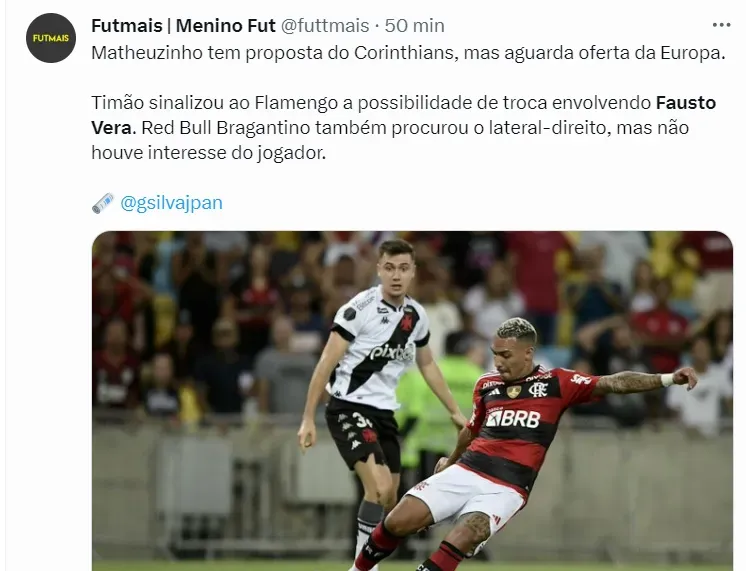 Se Vera pode ir para o Flamengo, o clube paulista tem interesse em Thiago Maia, justamente olhando para uma possível saída do volante em 2024. Por serem atletas com estilos parecidos, um acordo pode acontecer, seja envolvendo uma troca ou não.
