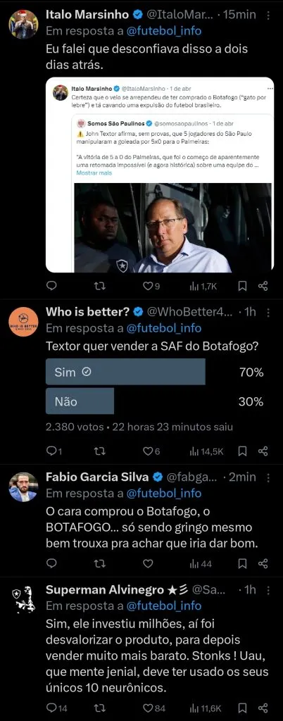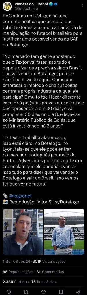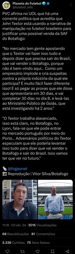 “Adversários políticos do Textor especulam que ele poderia levantar isso tudo para dizer que vai vender o Botafogo e sair do Brasil. Isso vamos ter que ver no futuro”, analisa PVC.