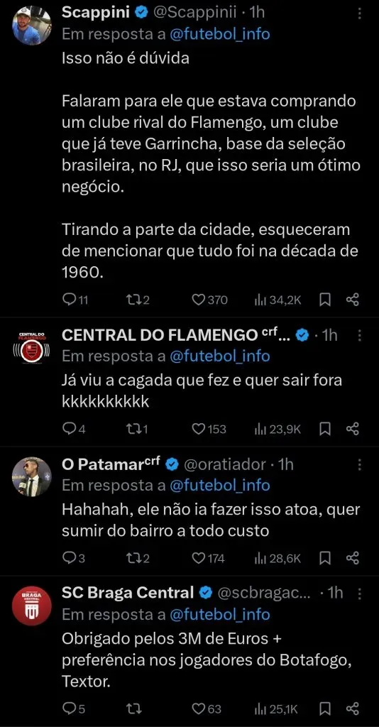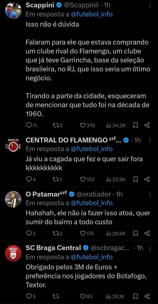 “O Textor trabalha alavancado, isso está claro, no Botafogo, no Lyon, fala-se que ele pode entrar no mercado português por meio do Porto”, sinaliza o comunicador.