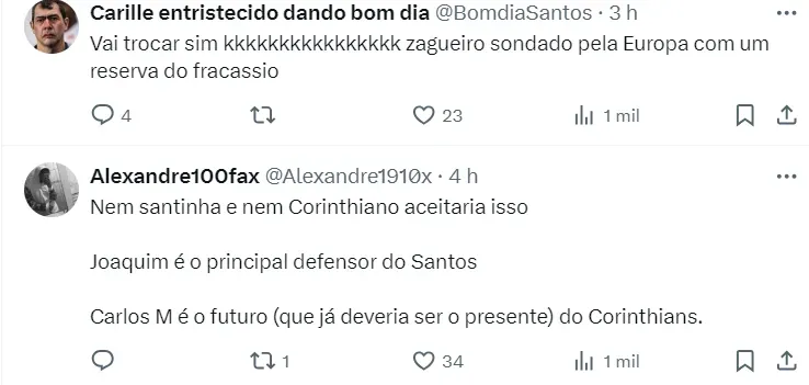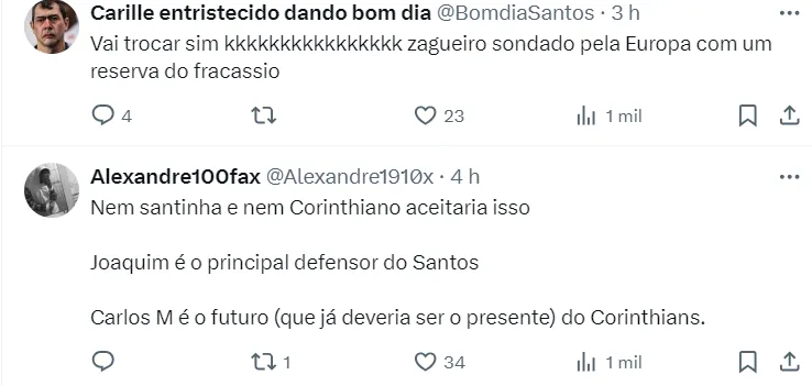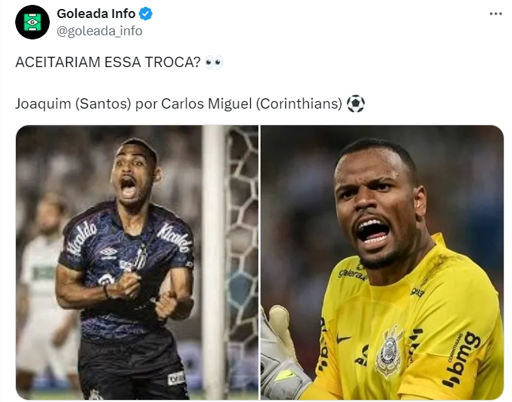 Um perfil no Twitter sugeriu uma troca de jogadores envolvendo Santos e Corinthians, em meio à informação de que o Peixe estaria interessado na contratação do goleiro Carlos Miguel.