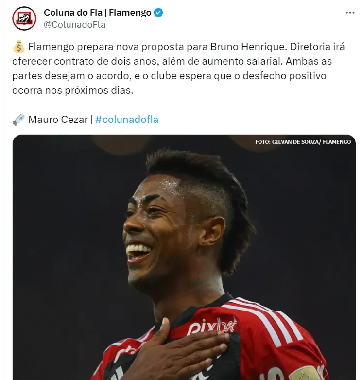 A tendência é que Bruno Henrique renove seu contrato com o Flamengo. O jornalista Mauro Cezar revela que o Fla está preparando uma oferta de dois anos para o atleta, juntamente com um aumento salarial. Além disso, de acordo com ele, ambas as partes desejam a renovação do contrato.