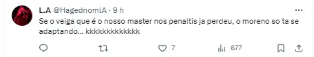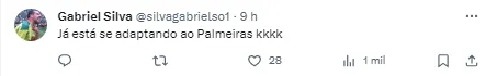 “Já está se adaptando ao Palmeiras” , “Era o que estava faltando para sacramentar hahaha perdeu pênalti, está 100% apto para jogar no Verdão” , “Tem o DNA do Clube”, escreveram.