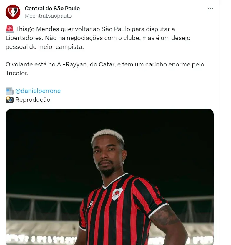 Apesar de ter passado pouco tempo no futebol do Catar, Thiago Mendes expressa sua vontade de retornar ao futebol brasileiro e atuar pelo São Paulo, sob a direção de Dorival Jr, conforme relatado por Daniel Perrone.