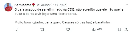 “O cara acabou de ser eliminado na CDB, não acredito que ele não queira pular a barca e vir jogar uma libertadores. Muito bom jogador, pena que o Casares só traz bagre barato”.