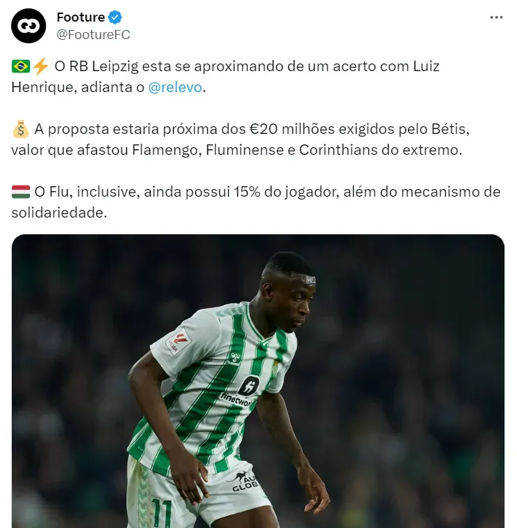O atacante Luiz Henrique, cria do Fluminense e atualmente defendendo as cores do Real Betis, da Espanha, encontra-se na mira de vários clubes brasileiros e pode voltar ao país ainda nesta janela.