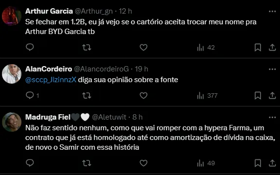 “Essas empresas estão analisando se de fato vale a pena fazer essa fusão e caso aconteça, o nome que viria ser gerado, daria nomenclatura para a Neo Química Arena e CT. Dr. Joaquim Grava”, completou.