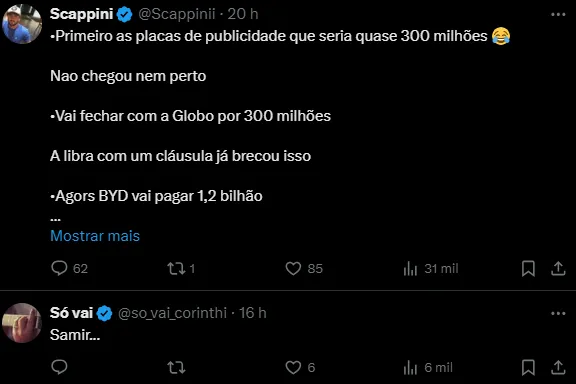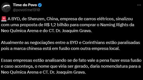 “A BYD, de Shenzen, China, empresa de carros elétricos, sinalizou com uma proposta de R$ 1,2 bilhão para comprar o Naming Rights da Neo Química Arena e do CT Joaquim Grava”, informa o jornalista.