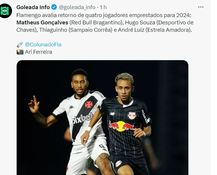 Matheus Gonçalves está emprestado para o Bragantino até o final do ano, e voltará ao Mengão para 2024, uma vez que o Braga não tem opção de compra do atleta.