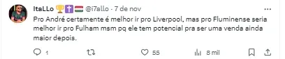 André está avaliado hoje pelo Fluminense em torno de 30 e 35 milhões de euros, aproximadamente entre R$ 156 e 182 milhões e possui contrato válido com a equipe carioca até dezembro de 2026.