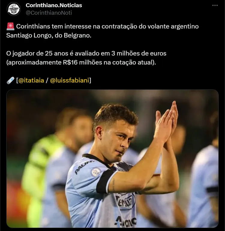 De acordo com as informações publicadas pelo jornalista Luis Fabiani, da Itatiaia, o Corinthians tem interesse na contratação do volante Santiago Longo, do Belgrano, da Argentina.