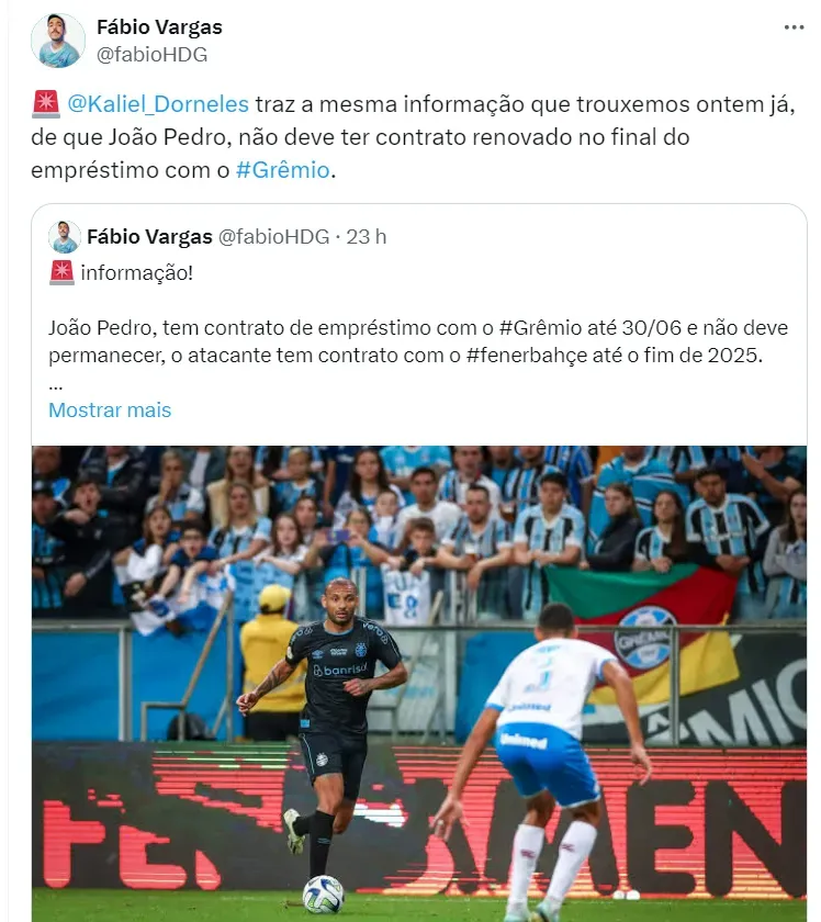 João Pedro, que chegou ao Tricolor, em 2023, tem seu contrato chegando ao fim com o clube gaúcho e esse vínculo não será renovado, conforme informações de Fábio Vargas e Kaliel Dorneles.