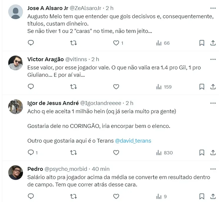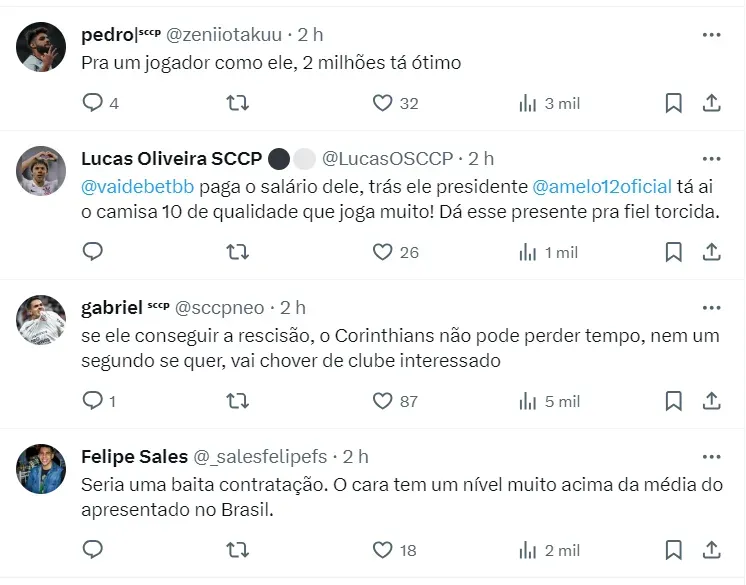 Parte da imensa torcida do gigante paulista está bastante animada nas redes sociais com a possível chegada de Igor Coronado no clube. O jogador é de interesse, mas um possível salário de R$ 2 milhões por mês assusta.