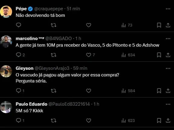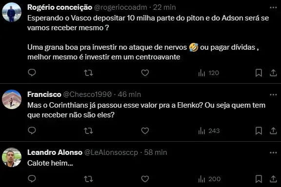 A informação é da Central do Timão na manhã desta segunda-feira (29): “Vasco terá que pagar mais R$5 milhões ao Corinthians após Lucas Piton cumprir meta contratual”, destaca.