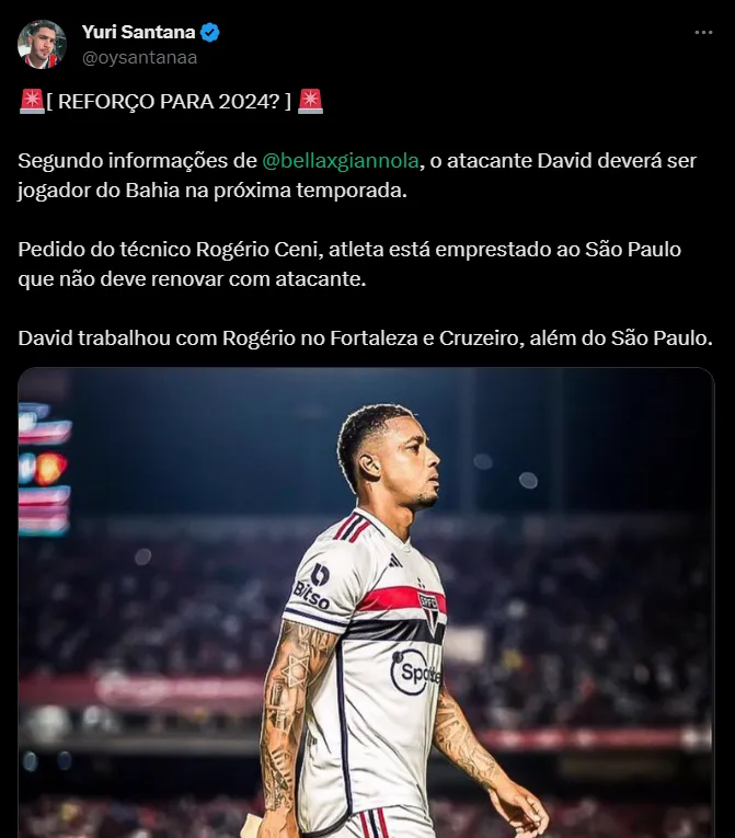 Segundo as informações publicadas pela jornalista Izabella Giannola, do portal “Lance!”, o Bahia tem interesse na contratação doa atacante David, que atua atualmente pelo São Paulo.