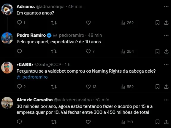 As informações do jornalista Pedro Ramiro dão o tom de quanto deve ser o acordo prestes a ser fechado no Parque São Jorge. O período previsto é para os próximos 10 anos.