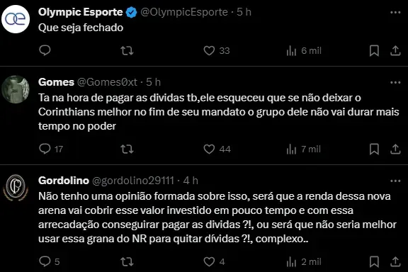 “Corinthians é o maior do Brasil e do mundo. Nos equiparemos com os europeus sobre o patrocínio. Fecharemos R$ 1 bilhão de patrocínio em até um mês. Falam que falo muito, mas posso provar e por isso eu falo”, disse o mandatário.