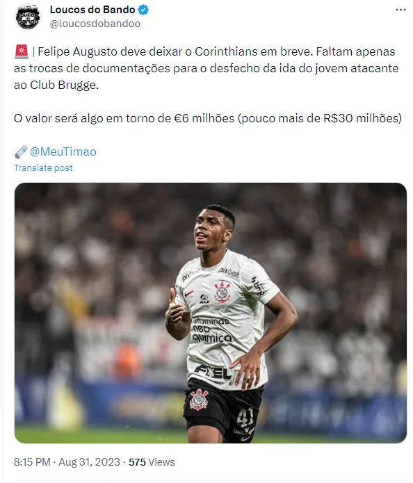 Com isso, o Corinthians recebeu uma proposta pelo atacante Felipe Augusto. O jovem de 19 anos é da base do Timão e teria recebido uma oferta de 6 milhões de euros (R$ 32 milhões), conforme informado pela rádio Itatiaia e pelo perfil ‘MeuTimão‘.