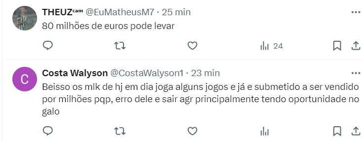 Neste último final de semana, na vitória do Galo por 2 a 0, diante do Itabirito, pelo Mineiro, o jovem também ganhou chances e entrou no segundo. A ideia do Atlético é dar bastante minutos para o jovem no Estadual.