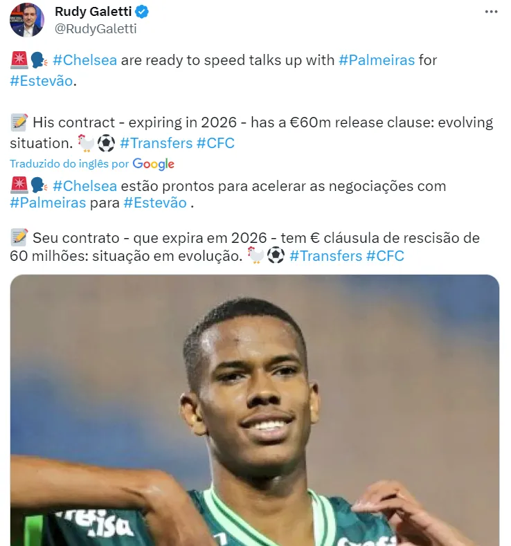 Em busca da mais reforços, os Blues estão de olho e pretendem avançar pelo futebol do jovem Estevão, do Palmeiras, partir de 2024, como informa o jornalista Rudy Galetti.