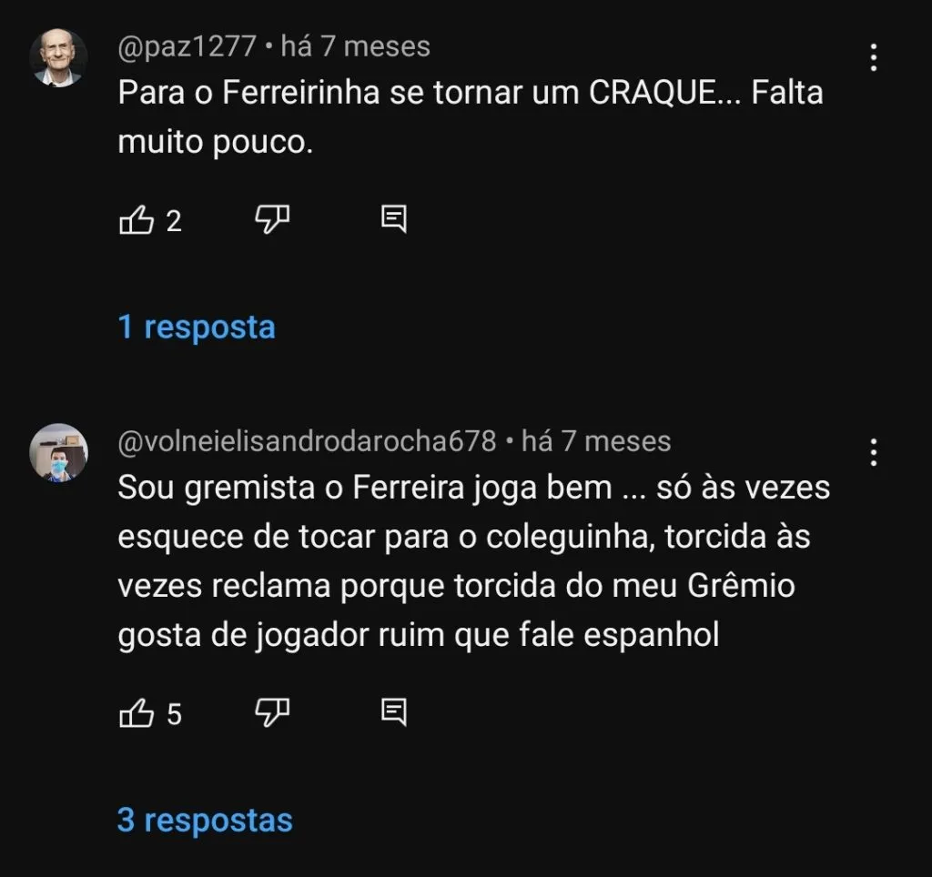 Ferreirinha, apesar de muito utilizado, vem sendo reserva na equipe de Renato Portaluppi, tendo disputado 32 jogos e participado de 10 gols em 2023.