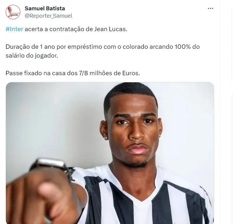 De acordo com a fonte, Jean Lucas acertou um contrato de uma temporada por empréstimo para jogar com as cores do Inter em 2024, com o passe fixado entre 7 a 8 milhões de euros.