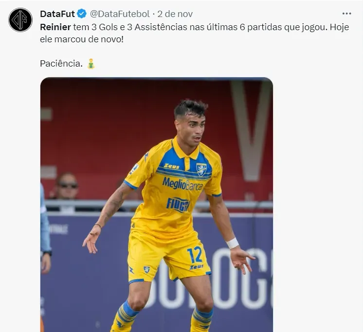 Cria do Flamengo, Reinier vive boa fase no futebol italiano, com as cores do Frosinone. Considerado, ainda, uma grande promessa do futebol brasileiro, o Real Madrid deseja vendê-lo ao final da temporada.