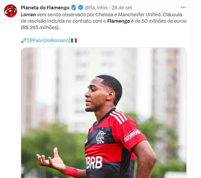 Conforme informações do portal ‘Fla web’, o Manchester City demonstrou interesse no jovem Lorran, uma das joias da base do Flamengo. A fonte exclusiva informa que há olheiros do City já presentes no Brasil e que o clube de Manchester deseja estabelecer um acordo com o Mengão em 2024, quando o jogador completará 18 anos de idade