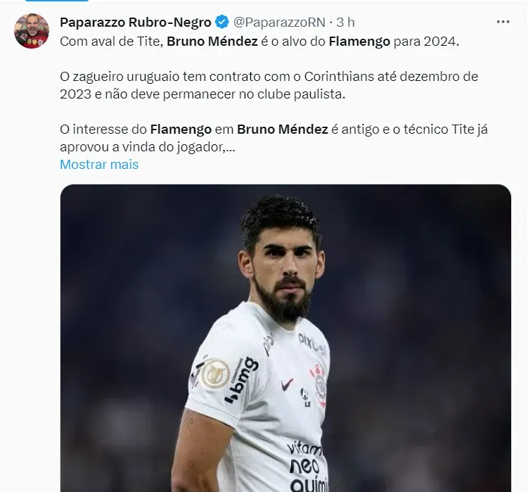 Bruno Mendez tende a chegar ao Mengão a custo zero, pois está com contrato se encerrando no Corinthians. O Timão teria desistido de renovar com o atleta, conforme aponta a fonte.