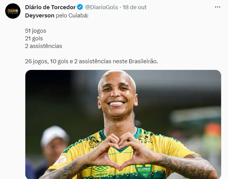 Há boas perspectivas de que o atacante Deyverson possa assinar com um dos gigantes do futebol brasileiro na próxima temporada. O jogador está em excelente forma com o Cuiabá, embora ainda tenha contrato válido com o clube até dezembro de 2024.