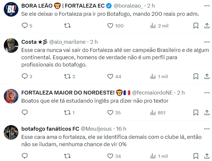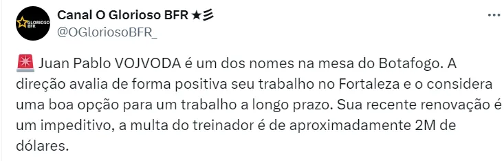 Crescem as chances do argentino Vojvoda deixar o Fortaleza para assumir o comando de uma grande SAF do futebol brasileiro. No momento, não há conversas, mas a possibilidade existe.