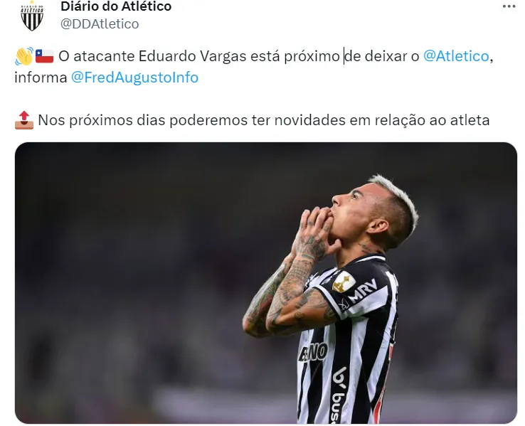 Eduardo Vargas pode ser a outra contratação de peso do Bahia. O chileno está sem espaço no Atlético-MG e sua saída deve ser confirmada em breve, segundo informa Fred Augusto em sua rede social.
