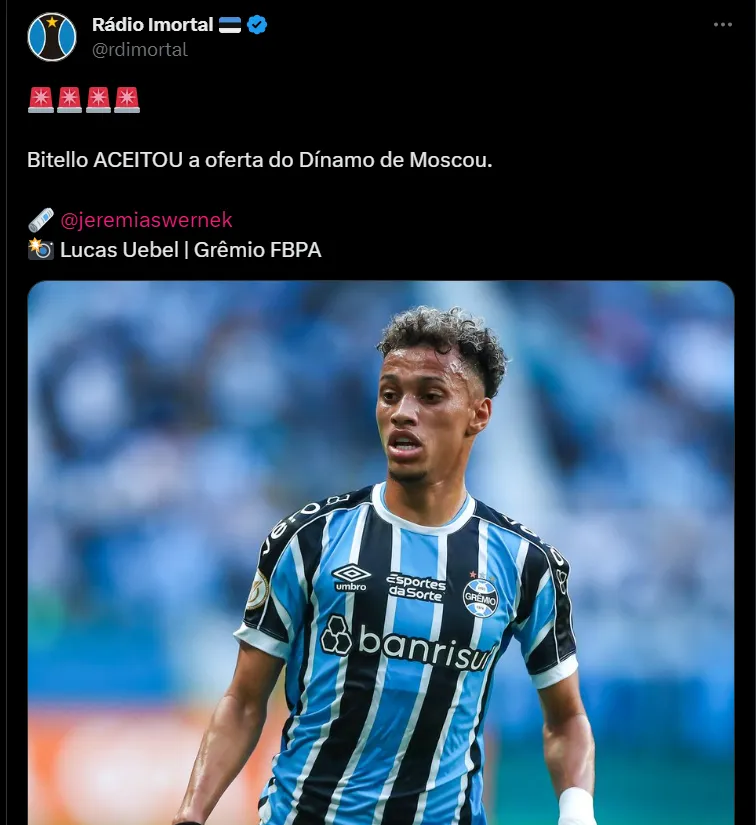 De acordo com as informações publicadas pelo “GE”, o atacante Bitello aceitou a oferta do Dínamo Moscou, da Rússia, e deverá ser vendido ao time em breve.