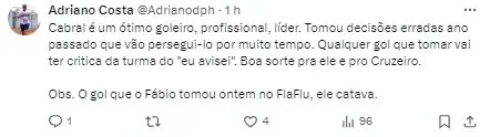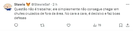 “Aceito demais se torcedor acha que falhei ou não. Acho que estou aqui para trabalhar, dar o meu melhor e honrar a camisa. E, no fim do ano, bater todas as metas. Vale lembrar que tem dois anos que somos a melhor defesa do Brasil (…) A gente continua trabalhando. Críticas e elogios não levo para o coração. Sei quem sou e tenho que continuar trabalhando muito”, finalizou.