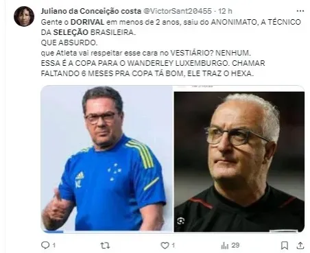 “Nunca teve isso aqui, é o país do futebol… acho que o Brasil já ganhou tanto, ficou pra trás, mas o Brasil é o Brasil, nós temos bons jogadores e bons treinadores, só que infelizmente o cara não tem tempo para trabalhar. Se a gente der tempo para um treinador trabalhar, entender que ficamos para trás, os europeus e argentinos estão na nossa frente. A seleção não pode ser ‘está na Europa, tem que convocar’, tem que convocar quem está melhor”, finalizou.