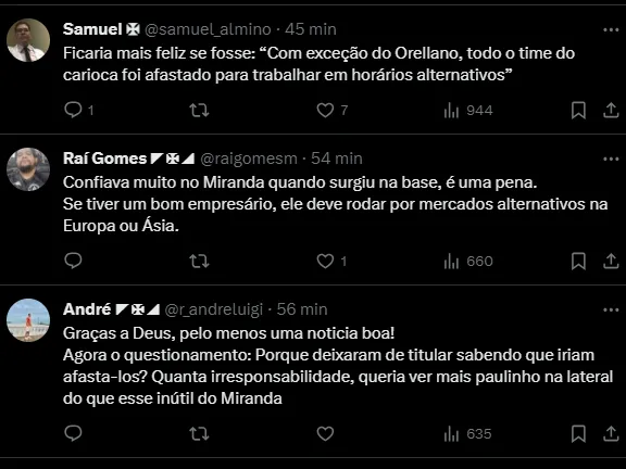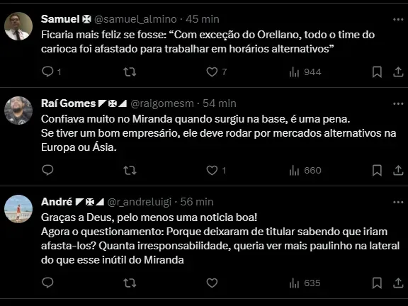É certo que dois atletas estão fora dos planos: Rodrigo e Miranda. A informação é confirmada pelo Globo Esporte. No entanto, existem pelo menos mais três profissionais comunicados da decisão da comissão técnica.