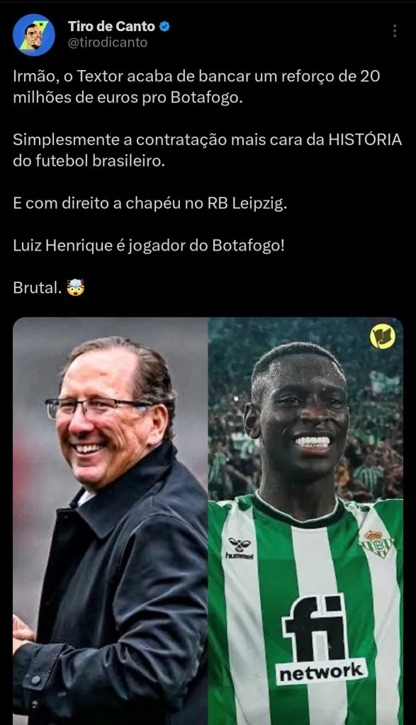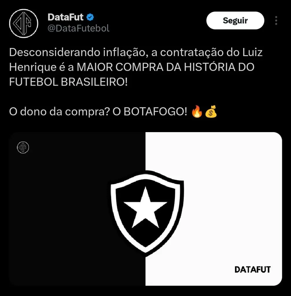 Nesta quinta, o Botafogo acertou de forma oficial a contratação do atacante Luiz Henrique, que pertencia ao Real Bétis. O jovem jogador custará cerca de €20 milhões aos cofres do clube, aproximadamente R$108 milhões.
