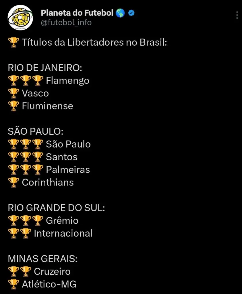 Atlético MG e Corinthians somam quatro conquistas cada um, enquanto o Vasco e Athletico Paranaense surgem logo em seguida, com três títulos a nível internacional conquistados cada um.